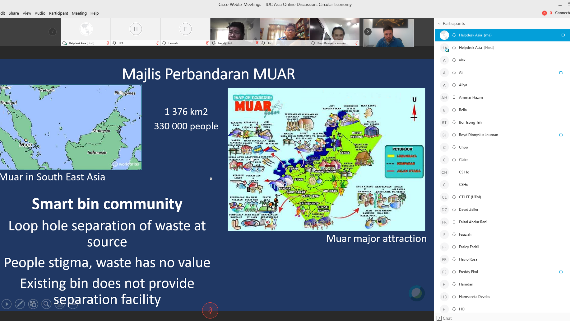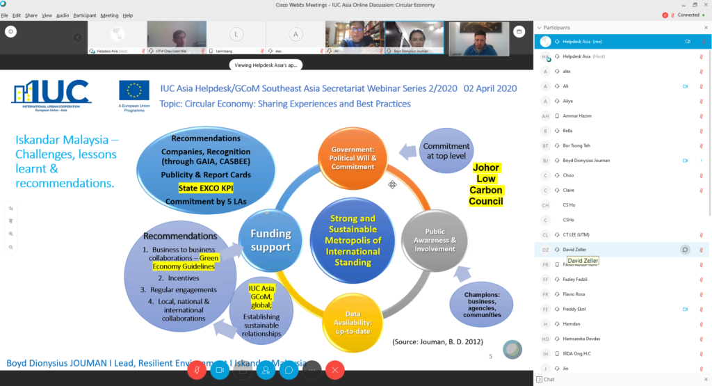 Online Webinar, 2 April 2020: The IUC-Asia organised an online video discussion today in cooperation with the Iskandar Regional Development Authority (IRDA) and the Universiti Teknologi Malaysia (UTM). Attending the call were 44 experts from cities in Europe and Asia, sharing experiences and best practices with regards to circular economies. The IUC-Asia team moderated the discussion, with presentations from policy leaders and urban managers in Italy and several Malaysian cities.