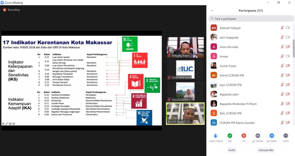 After months of social distancing and self-isolation in Indonesia, this month has brought the beginning of the transition to a “new normal” period. During this controlled social life, the IUC Asia Team held a virtual meeting with Makassar City Government for a capacity-building session on “Adaptation Planning Based on Climate Risk and Vulnerability Assessment (CRVA)” on 11 June 2020. The workshop was the second capacity-building session to arrange and develop the local Climate Action Plan (CAP) of Makassar City. The first one, development of GHG inventory, took place in March 2020.